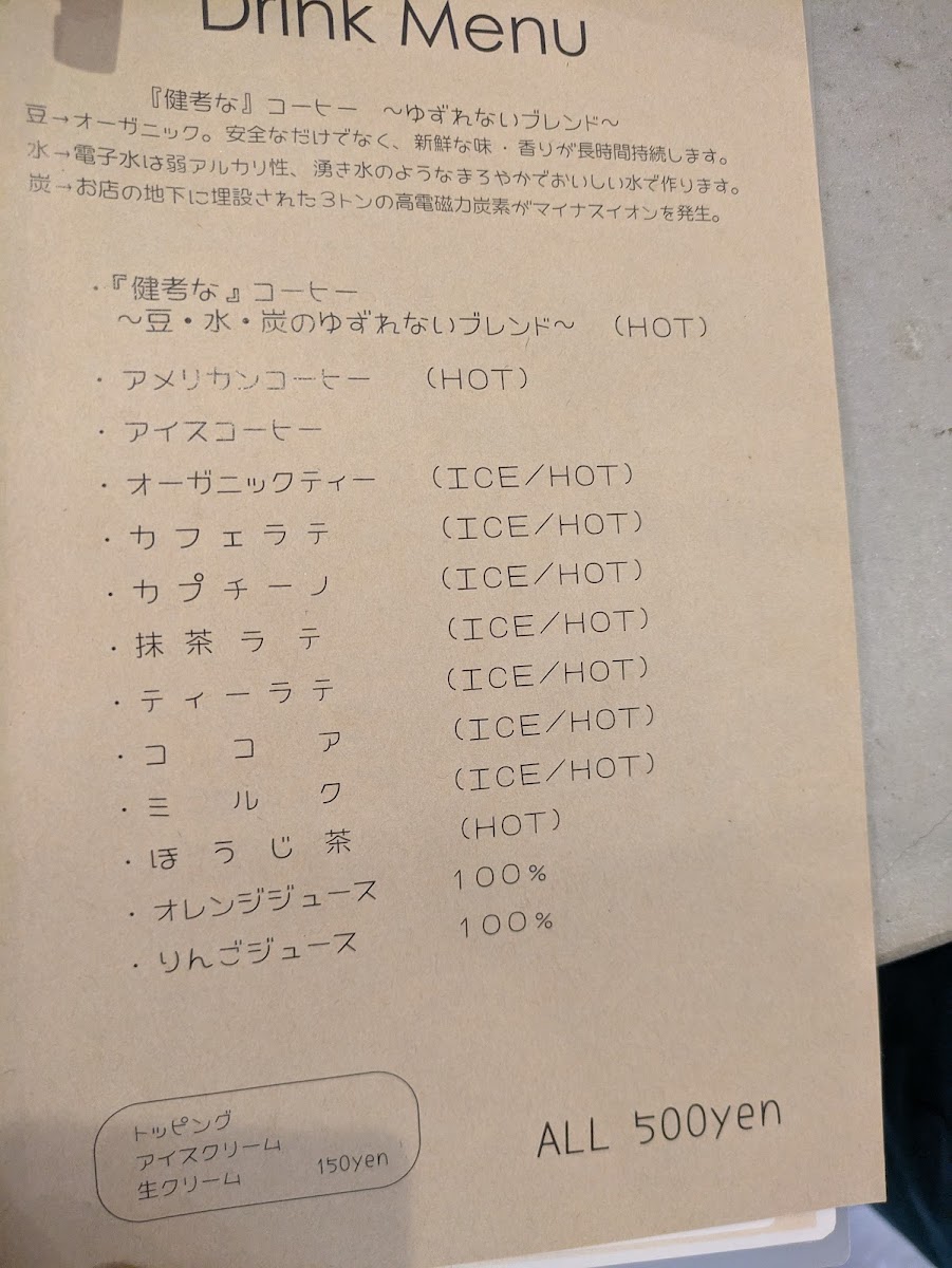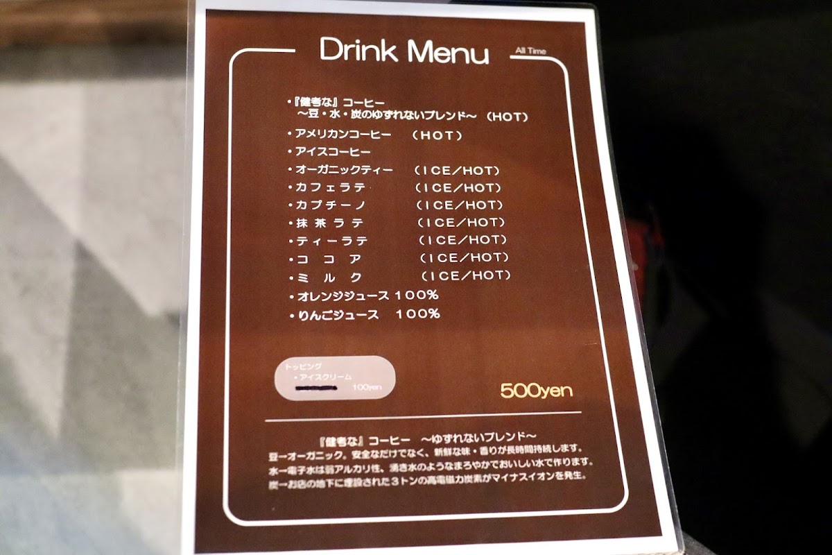 オーガニックコーヒー(ICE/HOT)カフェラテ(ICE/HOT)カプチーノ(ICE/HOT)ウインナーコーヒー(ICE/HOT)抹茶ラテ(ICE/HOT)オーガニックティー(ICE/HOT)ココア(ICE/HOT)ティーラテ(ICE/HOT)100%オレンジジュース100%リンゴジュース全て450円(税込)