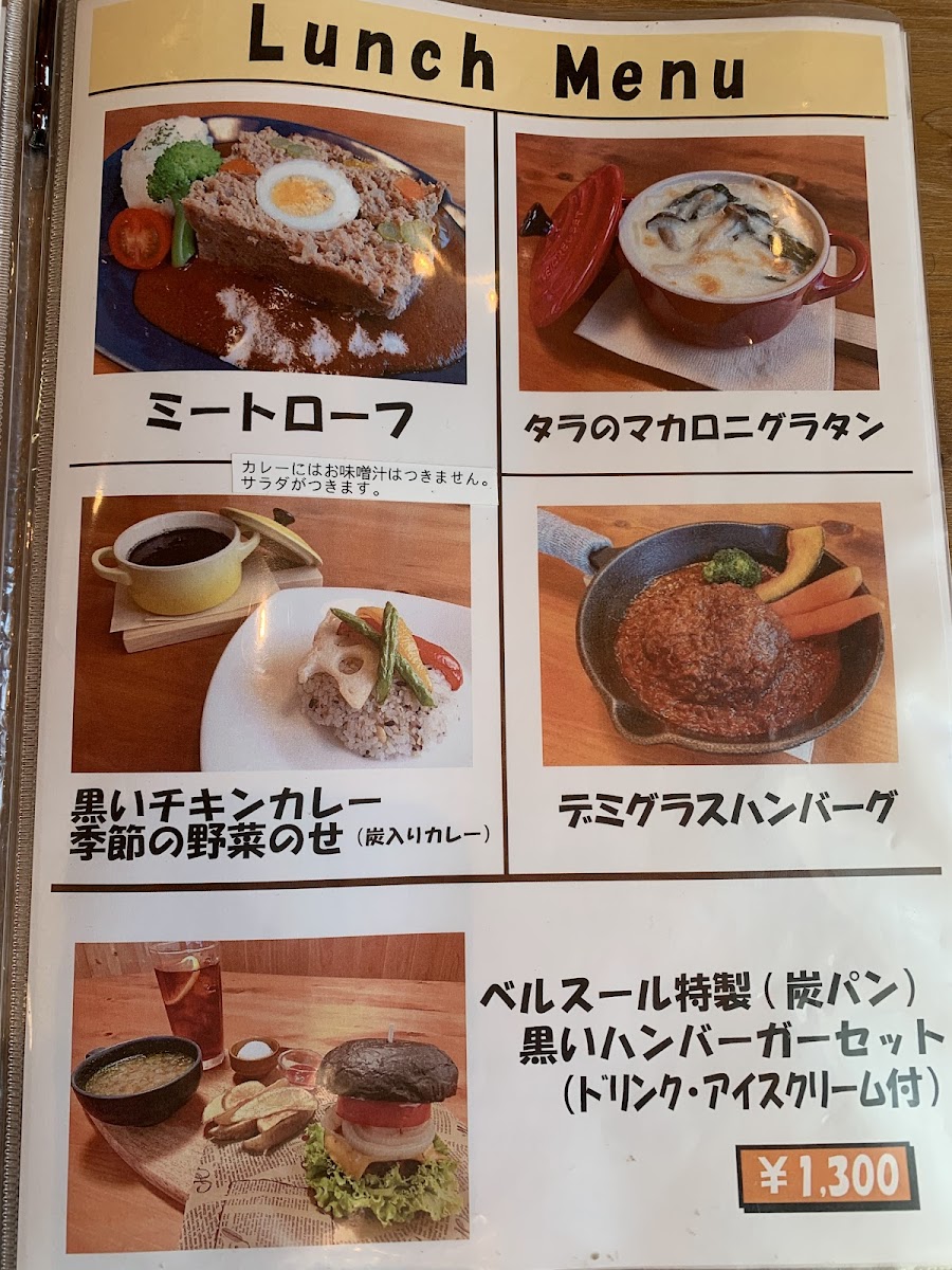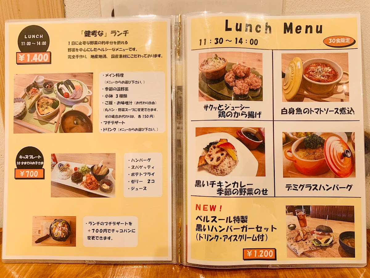 温野菜からスタートして5種類のおばんざいとメイン(肉・魚)・デザート・ドリンク。全てベルスールでつくっている自家製です。ご飯とお味噌汁ははおかわり自由です。1日に必要な野菜の約半分を摂れる、野菜を中心にしたヘルシーなランチメニューです。完全手作り、地産地消、国産素材にこだわっております。 【こだわりの野菜】すべて国産の野菜。毎日配達される新鮮なお野菜です。安全に作られた野菜で地元生産者一押しの野菜ばかりです。月に二回メニューを替えて季節に合った旬の野菜をふんだんに使った小鉢料理をお楽しみいただけます。 メイン料理は肉・魚料理5種類のなかからお選びいただけます。 【ある日のメイン料理5種】●ハンバーグデミグラスソース●あさりと白身魚のアクアパッツァ●自家製ホワイトソースのグラタン●鰆のレモンクリームソース●国産豚カツオリジナルBBQソース※2週間ごとにメニューをリフレッシュ!5種類の中からお好きなメニューをお選び下さい。