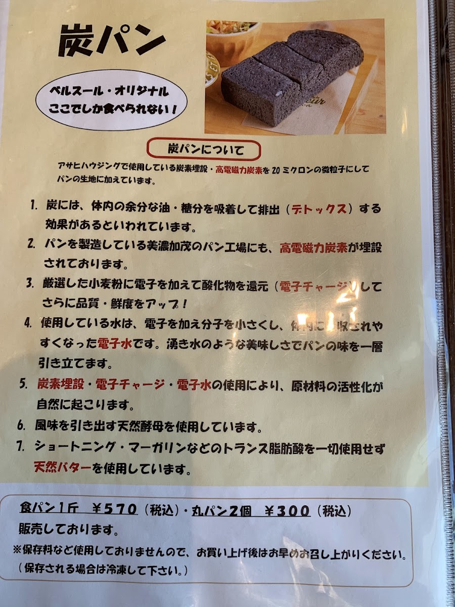 きめ細かいこだわりの国産小麦粉に20μの炭の粒子を入れ、丁寧に焼き上げた食パン。デトックス・ダイエット効果があるとされています(食品衛生上の問題はありません)。その他にも、電子水、天然酵母、天然塩、天然バターなどを使用し、炭以外の材料にもこだわったパンとなっております。サラダ・昔ながらの製法の牛乳からつくったヨーグルト・卵を添えています。パンの予約販売も承っておりますので、詳細はスタッフにお尋ねください。